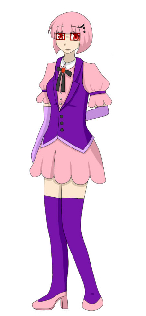 ・ピンクのブラウスに同色のキュロットショートパンツを着てます。紫のベストは背中が開いてるタイプの物です。薄紫のロング手袋をつけていて、肌はあまり見えないようになっています。