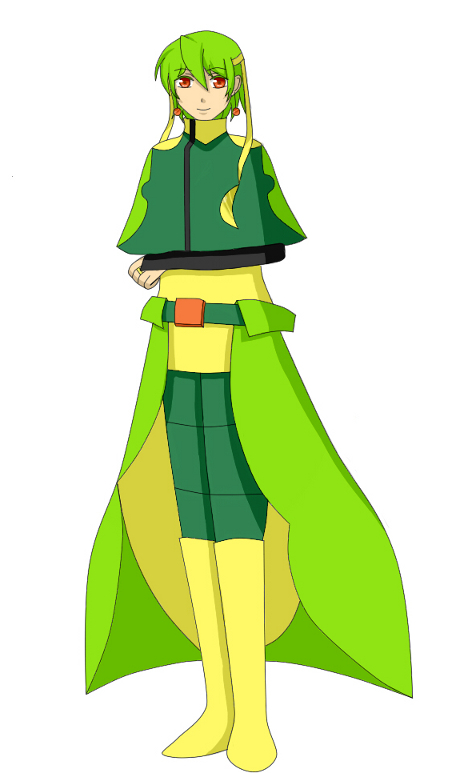 ・黄緑色の髪で襟足が少し長め。長い部分は襟の中に入ってます。前髪の下を通って黄色い紐が一周しており、左右から下に垂れてます。垂れた先端に金属の何かがついてる←