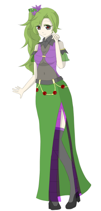 ・胸元とお腹がシースルーになっていて透けてます。見えないけど背中も上の方は透けてる。胸を隠してる服はベストみたいな感じになってて、真ん中の金具で留めてあります。首には付け襟。両腕には縁が金で黒のギザギザした金属の、下に緑のシースルーの布がひらひらがついてる腕輪を付けてます。