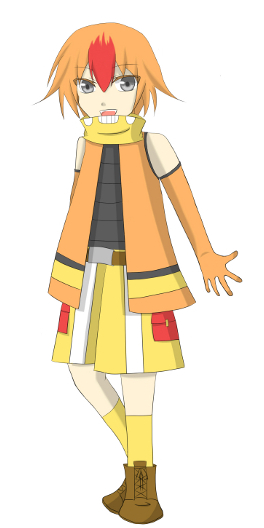 ・首にはネックウォーマーをつけてますが、それで口元を隠すのが癖になってる。オレンジ色のベストの長いの(?)は後ろに帽子がついてます。インナーは黒のボーダーでノースリーブ。